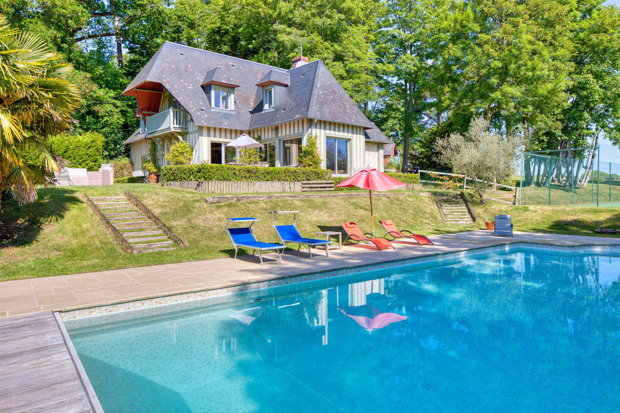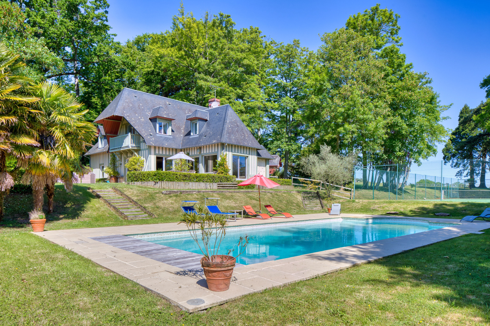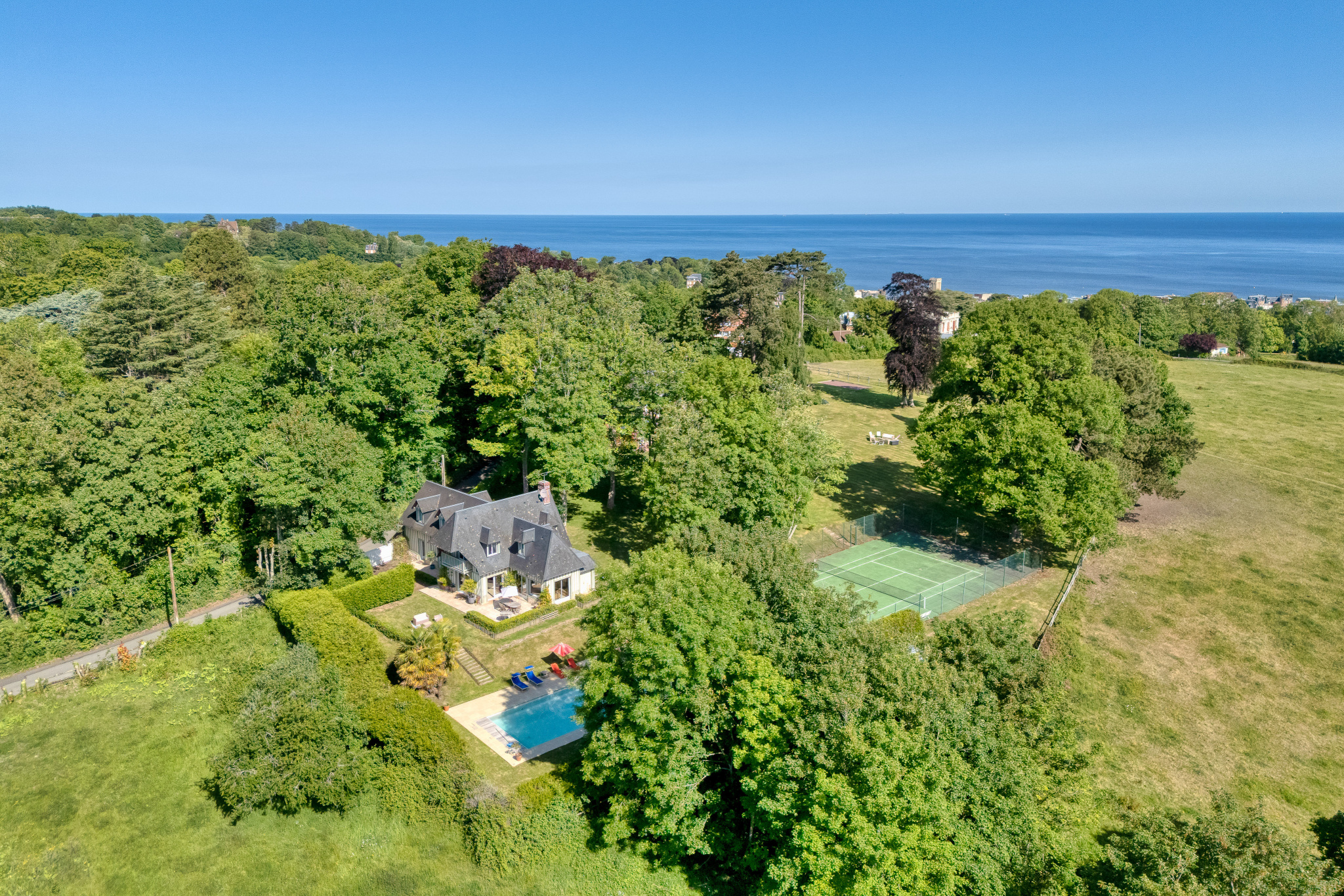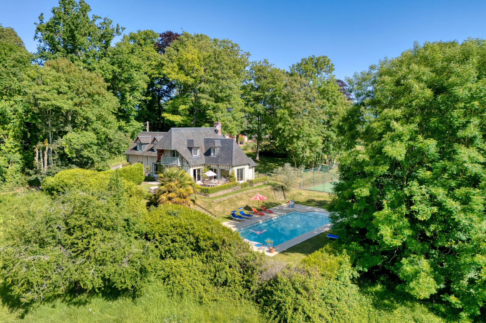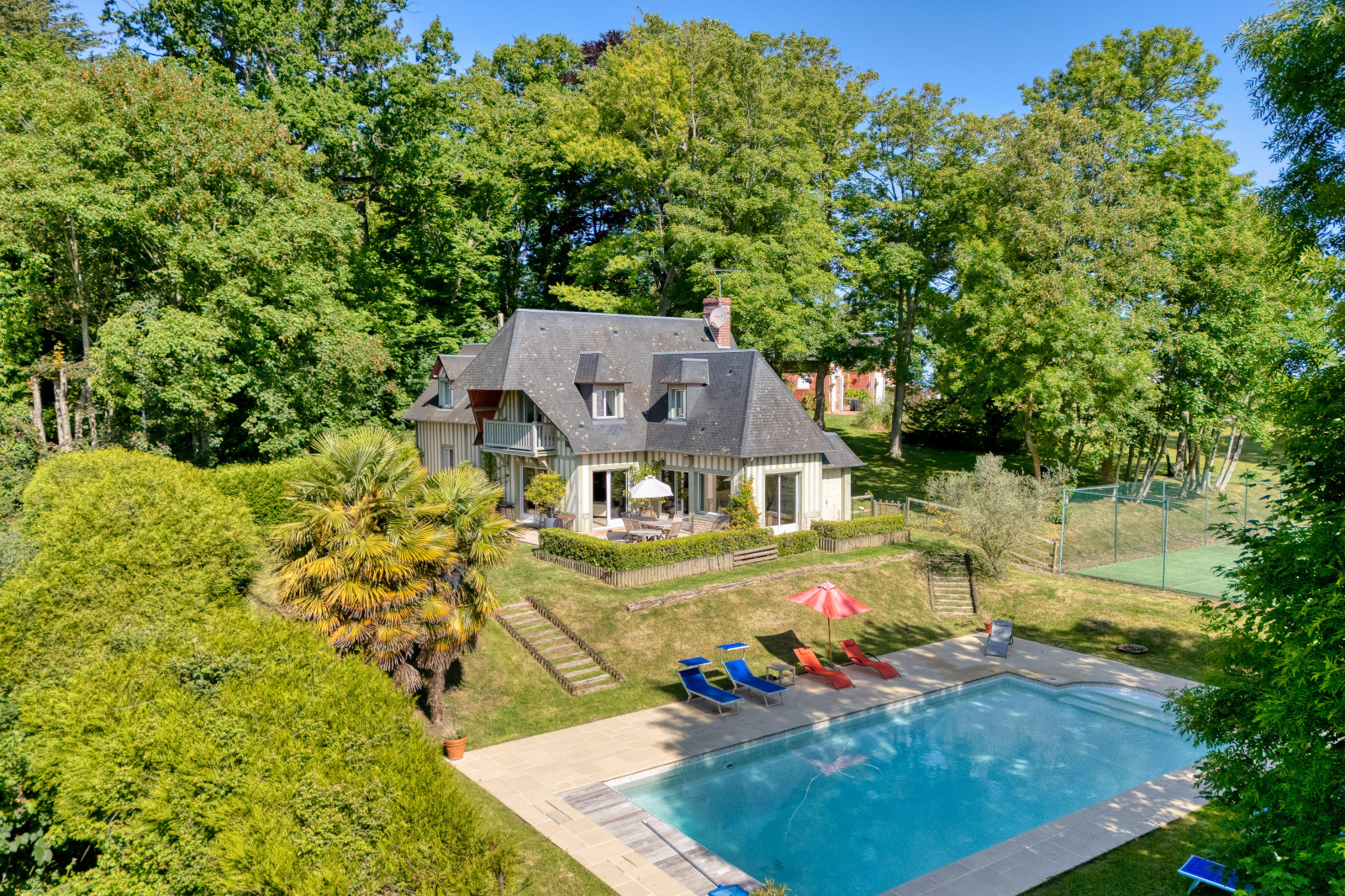 Villers-sur-Mer (14640)XXX NORMANDY IMMOBILIER VILLERS SUR MER XXX Idéalement située à quelques minutes à pied du centre ville de Villers sur Mer , au coeur d'un environnement naturel préservé et particulièrement recherché, cette élégante propriété récente signée Volkaert s'implante harmonieusement sur un parc paysager d'environ 1500m2 sublimé par de remarquable arbres centenaires. Développant près de 200m2 de surface, la demeure offre des volumes généreux et une qualité de prestation. Au rez de chaussée, une majestueuse réception baignée de lumière s'articule autour d'une cheminée de caractère et s'ouvre sur jardin. Une cusine américaine prolongée par une arrière cuisine, complète cet espace convivial . Une chambre lumineuse en rez de chaussée avec salle d'eau attenante et WC viennent parfaire ce niveau . A l'étage, le palier déssert trois belles chambres, dont une suite disposant de sa salle de bains privative. Une salle d'eau supplémentaire, dressing et des toilettes indépendants complètent ce niveau. Cellier indépendant avec chaufferie. A l'abri des regards, le jardin offre une atmosphère confidentielle, véritable écrin de verdure où s'inscrit une piscine à l'euro-sel chauffée. Une adresse rare, où le charme de la campagne rencontre la douceur du bord de mer, à deux pas du coeur de ville.