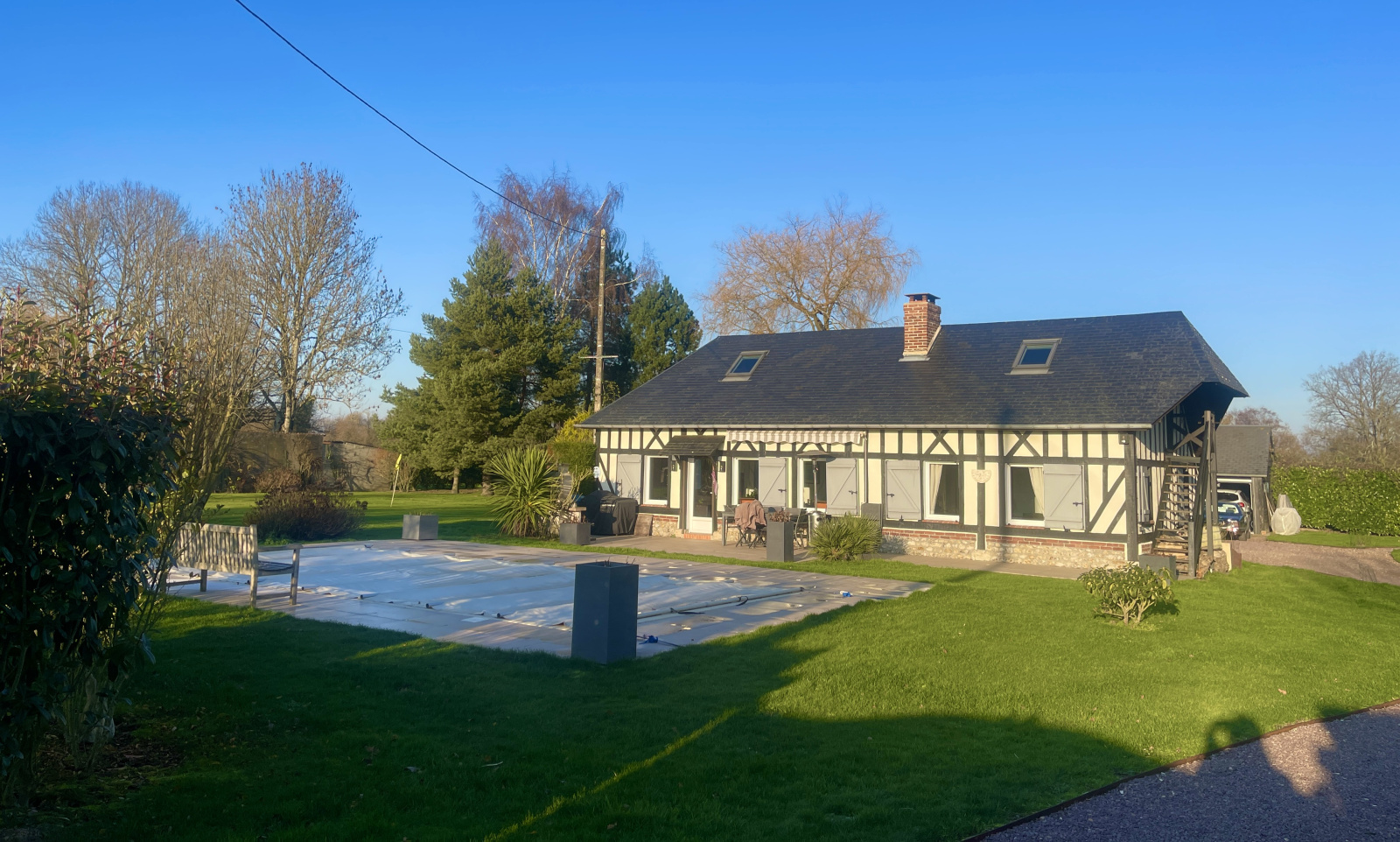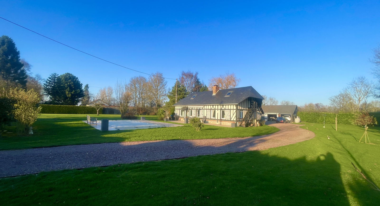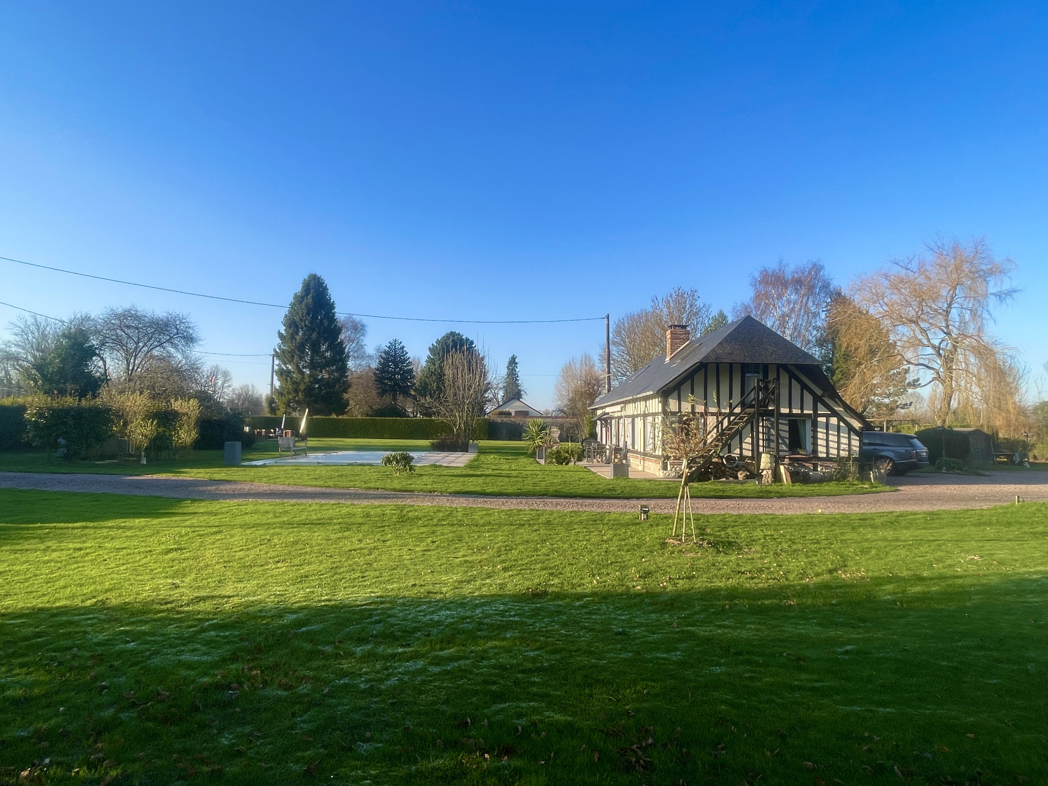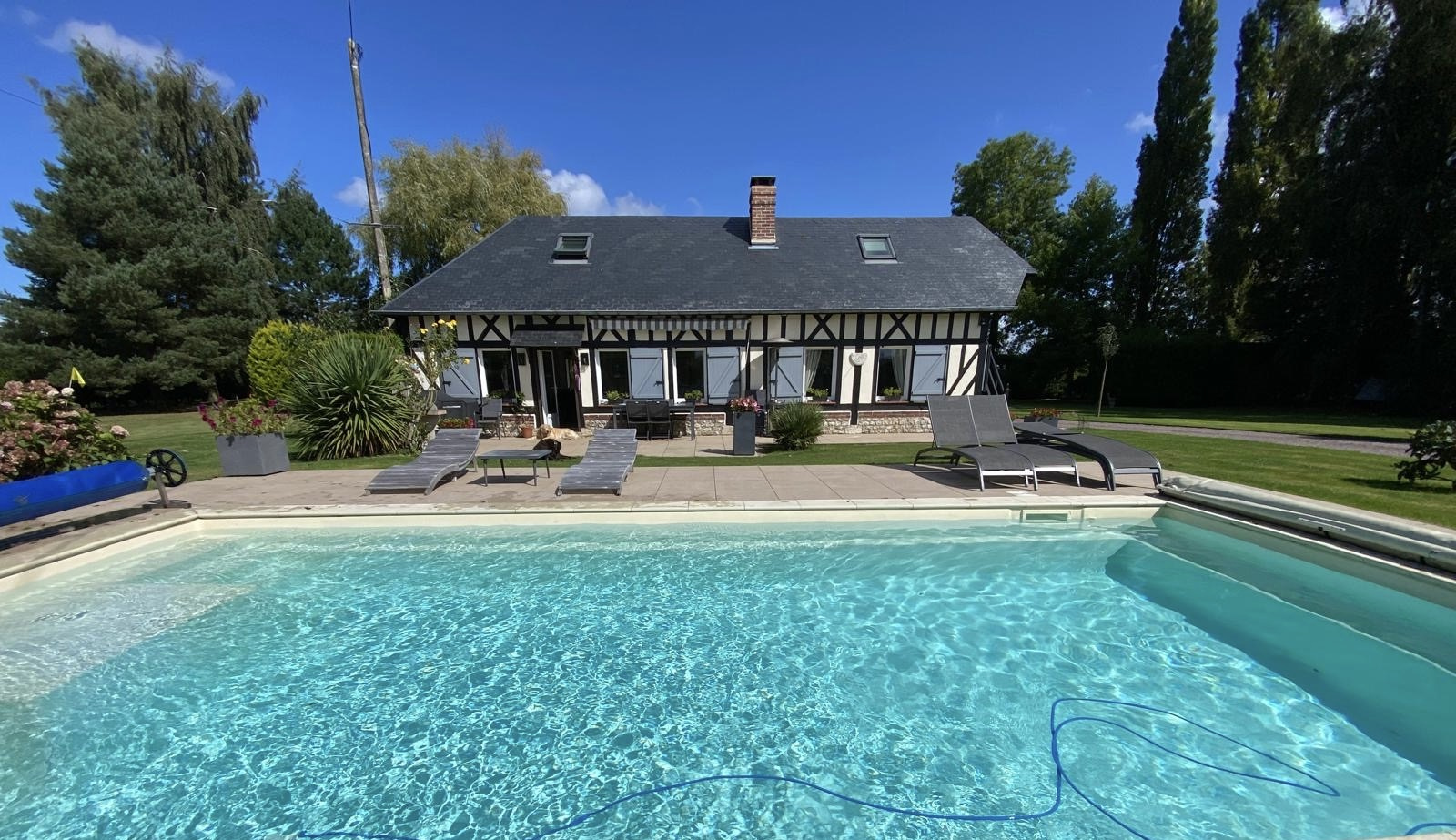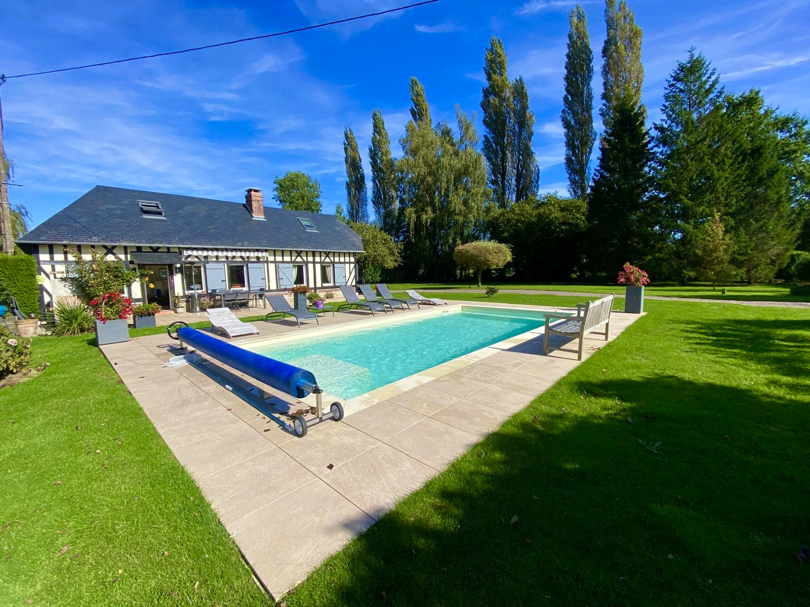 Pont-l'Évêque (14130)**** NORMANDY IMMOBILIER VILLERS SUR MER **** A seulement 5 minutes de PONT-L'EVEQUE, au coeur d'un environnement campagne rare et préservé, au bout d'un chemin bucolique, découvrez cette superbe maison Normande à colombages, entièrement rénovée avec des matériaux de belle facture. Implantée sur un magnifique terrain clos et paysagé de 4300m2, avec pisicne , cette propriété de caractère offre des volumes généreux et une atmosphère chaleureuse : vaste séjour-salon plain sud avec cheminée, cuisine semi ouverte de belle gamme, chambre de plain pied avec dressing, ainsi que trois chambres à l'étage avec salle d'eau et wc.